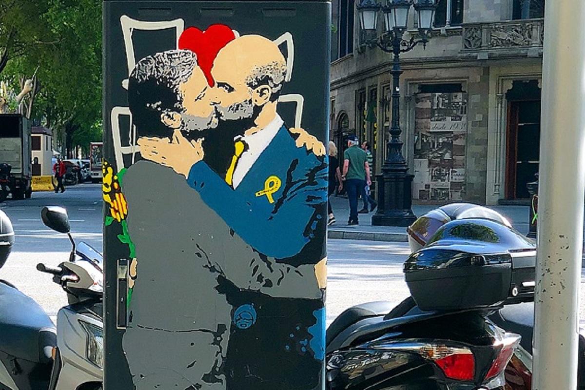 A figura dos dois treinadores de futebol, que têm uma longa e reconhecida rivalidade profissional, chamaram a atenção das pessoas que passeavam pela cidade de Barcelona. A peça é da autoria de um artista urbano espanhol.