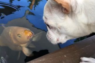 Conheça a história de amor de Daisy e Frank. Uma cadela bulldogue francês e uma carpa japonesa