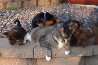 Gato vê o seu espaço invadido por matilha de cachorrinhos. Veja a sua reação