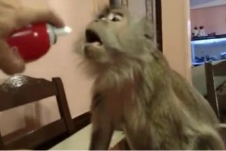 Esta macaquinha é muito gulosa e adora comer chantilly diretamente da bomba. Veja o ar dela enquanto se delicia