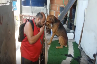 Depois do trabalho este cão recebe o dono de braços abertos. Perdão, de… patas abertas
