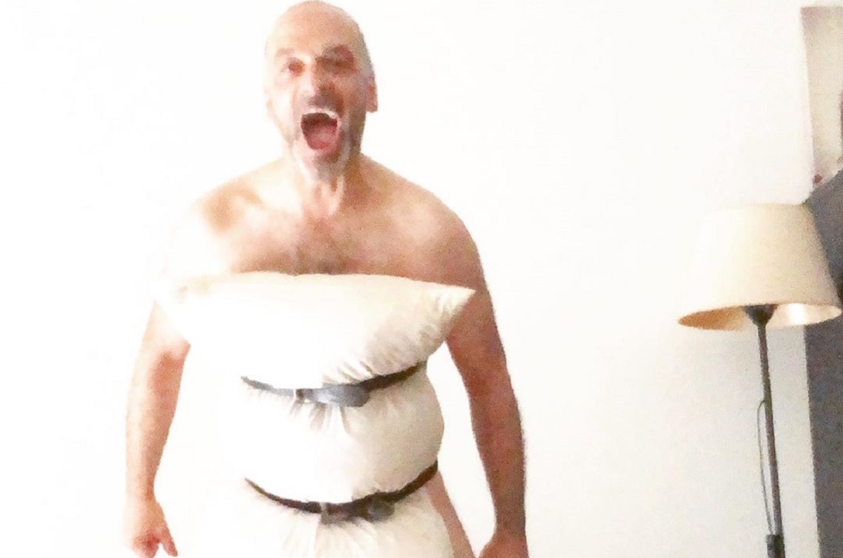 Heitor Lourenço aceitou o Pillow Challenge que se tornou viral nas redes sociais. Por isso, o ator despiu-se e vestiu apenas uma almofada presa por dois cintos.