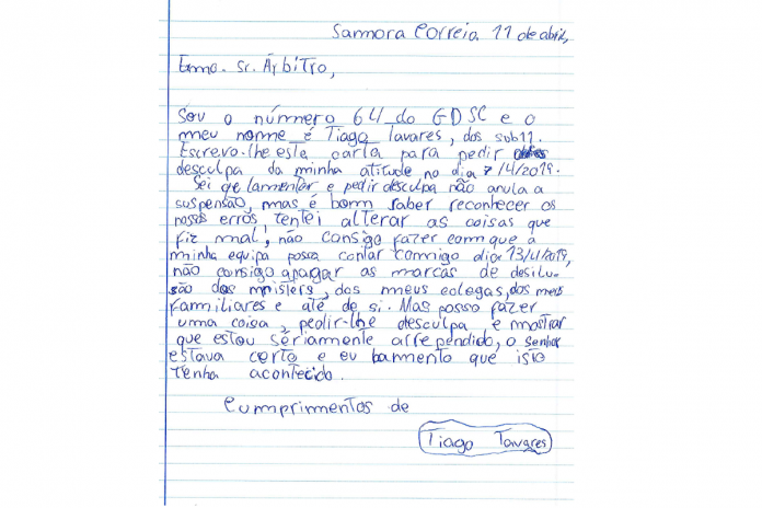 No texto, após a sua apresentação formal, o jogador escreveu: “Escrevo-lhe esta carta para pedir desculpa pela minha atitude no dia 07/04/2019. Sei que lamentar e pedir desculpa não anula a suspensão, mas é bom reconhecer os erros, tentei alterar as coisas que fiz mal.”