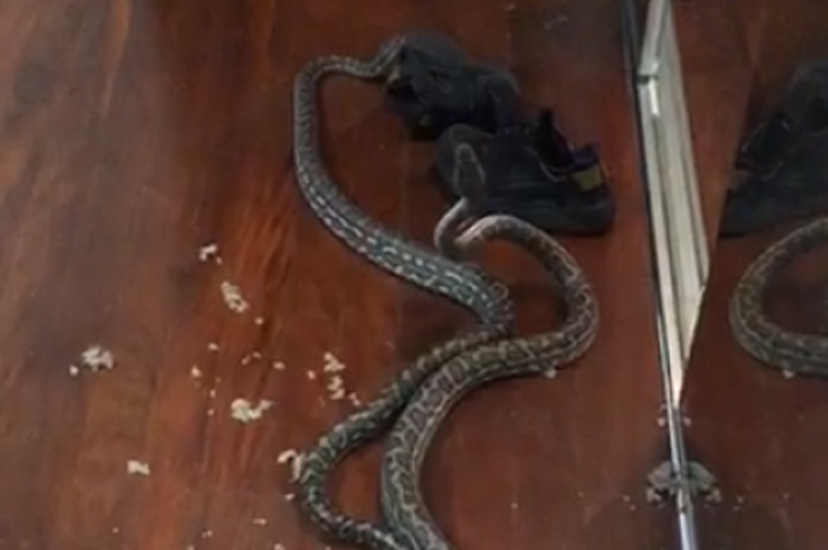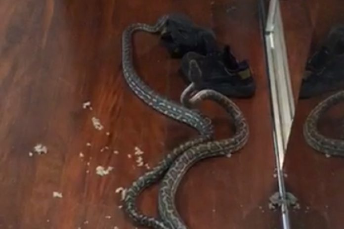 Duas pitons macho caíram, literalmente, do teto no interior de uma casa na Austrália através de uma entrada para ventilação. Estavam à luta e à luta continuaram, até serem capturadas e libertados a mais de um quilómetro de distância.