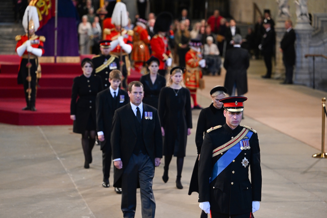 O príncipe William, filho do Rei Carlos III estava na frente, sendo que ao lao estavam os primos Zara Tindall e Peter Philips, filhos da princesa Ana, enquanto o irmão Harry permaneceu no lado oposto, junto às filhas do príncipe André, as princesas Beatrice e Eugenie. Já os filhos do príncipe Eduardo e os netos mais novos, Louise (18 anos) e James (14 anos), ficaram no meio.