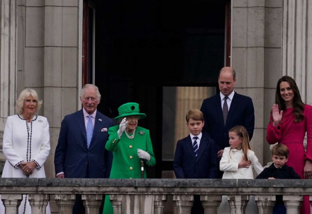 Aos 96 anos, vestida de verde, a monarca surgiu ao lado dos príncipes Carlos e William e das suas mulheres e filhos.