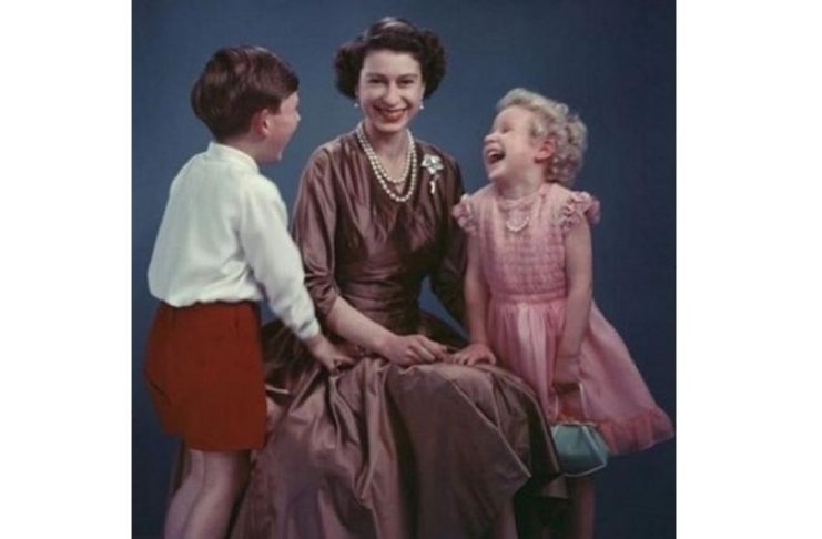 Isabel II posa ao lado dos filhos, o príncipe Carlos e a princesa Ana (1945).