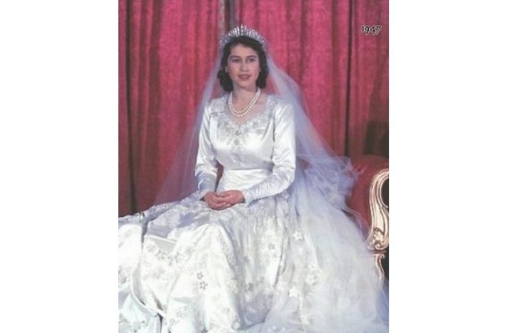 Isabel vestida de noiva em 1947.